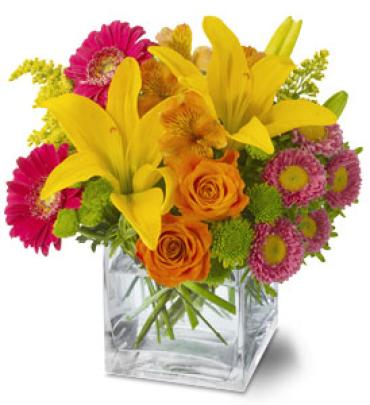 Make a statement with this colorful arrangement. Yellow lilies, set against a jumble of hot pink, orange and green flowers and presented in a modern glass cube vase! This vivid bouquet will bring warm-weather fun to someone?s day. Orange roses and alstroemeria, yellow Asiatic lilies, pink Matsumoto asters, hot pink miniature gerberas and green button spray chrysanthemums ? accented with oregonia and solidaster ? are delivered in a clear glass cube vase. About 8" diameter