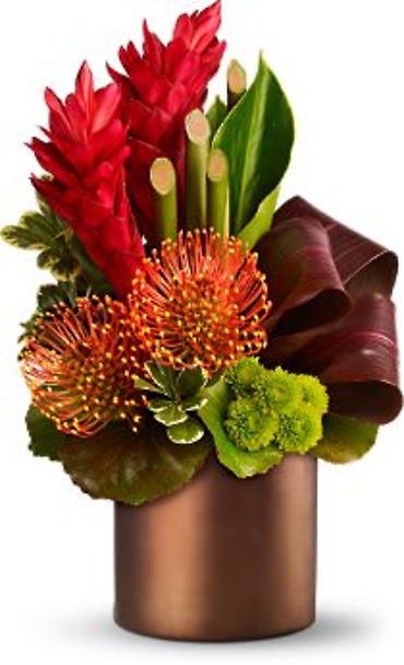 This wild and wonderful array of exotic flowers in a metallic cylinder vase is a contemporary work of floral art inspired by the beauty of a glorious tropical oasis. Go ahead, take someone's breath away. The imaginative arrangement includes ginger, pin cushion protea and green button spray chrysanthemums accented with red ti leaves and galax leaves - delivered in a brown ceramic cylinder vase. Bouquet is approximately 10 1/2? X 16 1/2? H". Deluxe and Premium versions are larger then the shown arrangement.