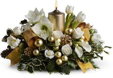 Cast a golden illumination upon your holiday celebration with this gleaming centerpiece of pure white blossoms and fresh evergreens, mingled with decorative golden elements, and arranged around a gold-colored pillar candle. It?s a majestic floral arrangement that will add a touch of splendor to any special event. A mix of fresh white flowers such as amaryllis, tulips, spray roses and miniature callas, plus fresh evergreens ? accented with golden ornament balls, gold-sprayed pinecones and a golden ribbon ? is arranged in a dish around a golden pillar candle. Approximately 22" (W) x 12" (H)