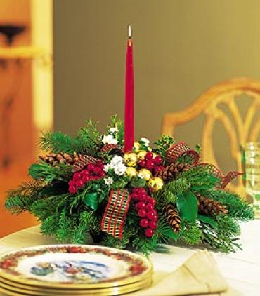 This wintry centerpiece with its holiday decor captures the holiday spirit in all its glory. Evergreens accented with white asters, along with berries, pinecones, balls and ribbon, together with a red taper candle in a centerpiece tray. Approximately 16" W x 17" H